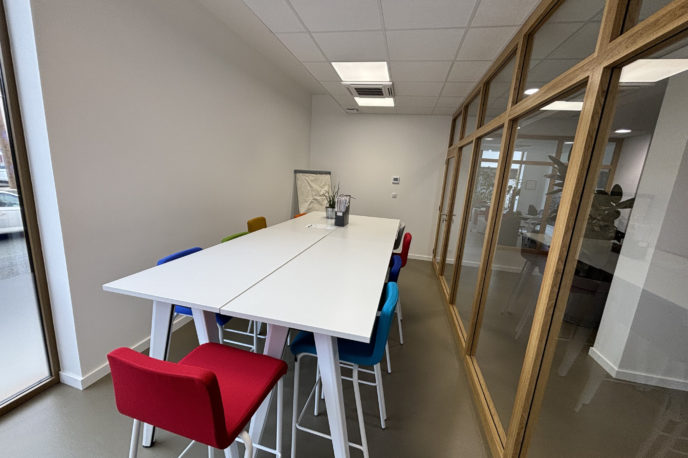 Salle de réunion de 10 personnes à disposition, espace convivialité et kitchenette.